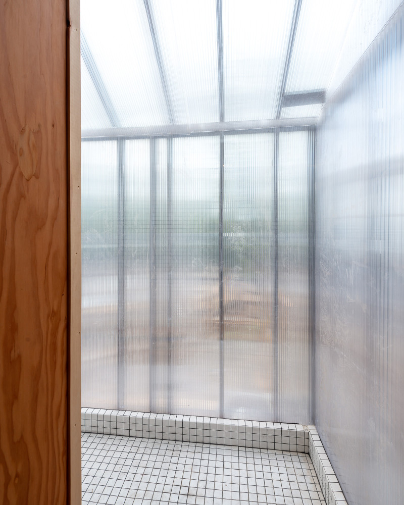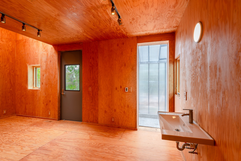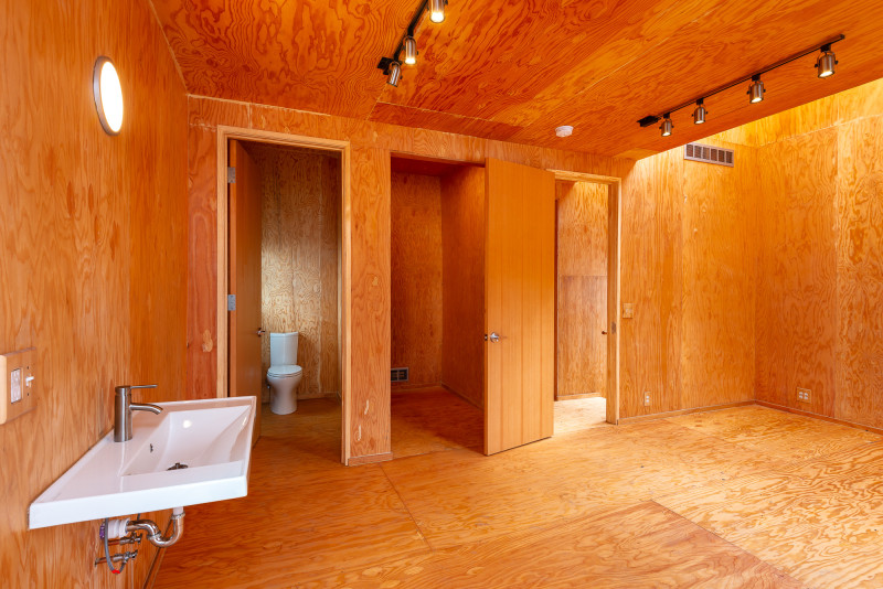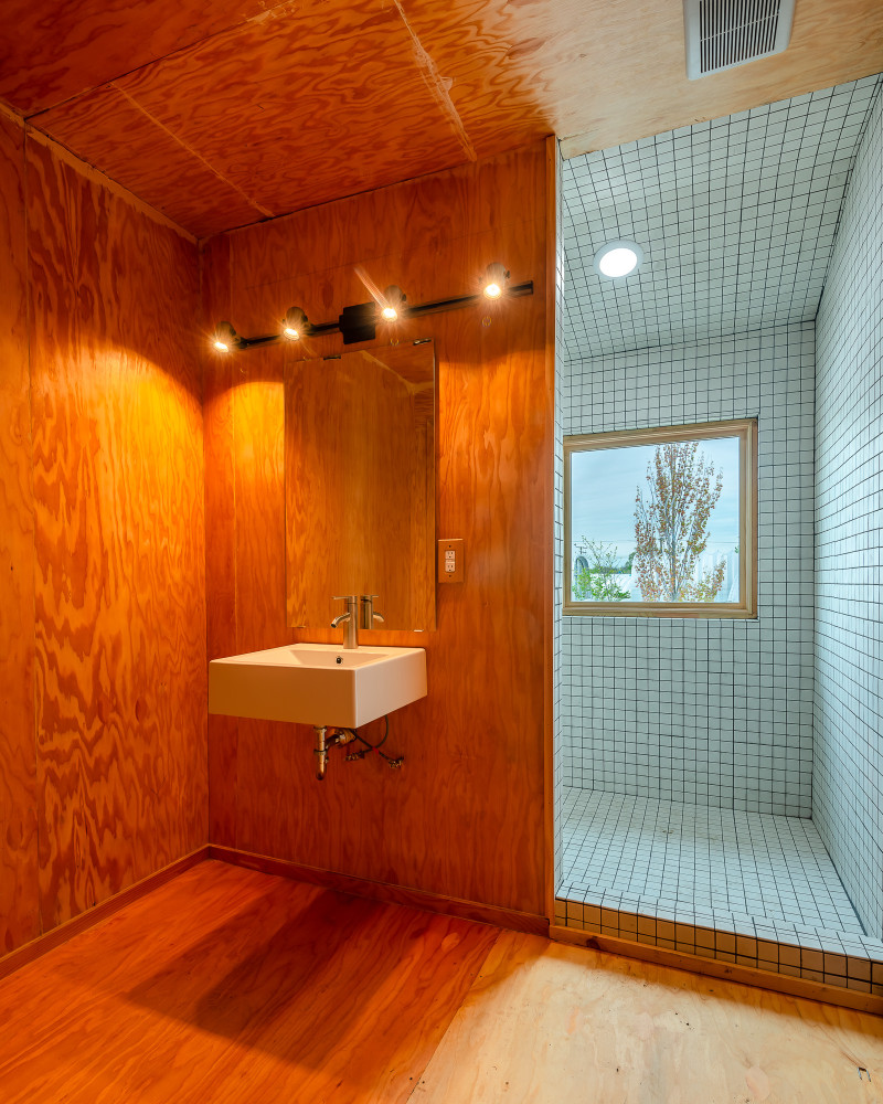 The home offers special moments: double height spaces with skylights, a 100% polycarbonate shower that protrudes off the back of the house, celebrated wash basins out in the open, and spectacular views of True North and the Flower Farm. The result is a 2 bedroom, 2.5 bath home that is both simple and spectacular.