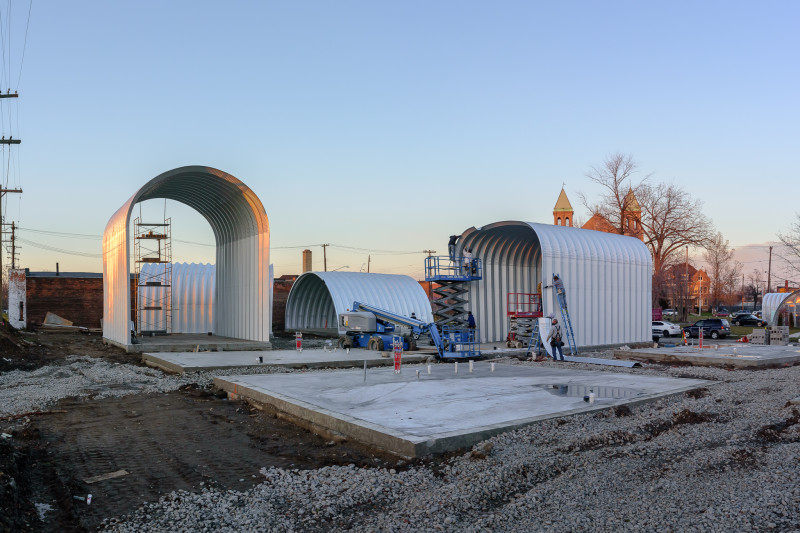 With the Quonset Hut, we used: steel tube, angle-iron and insulated Polycarbonate to construct the end walls - all welded and assembled on-site. For the units on the street, we implemented sections of cinderblock wall for a bit more privacy.